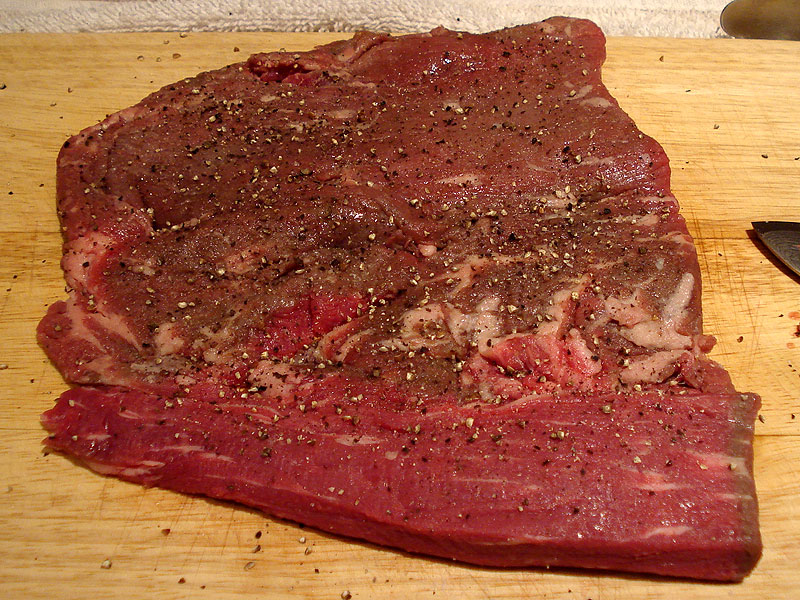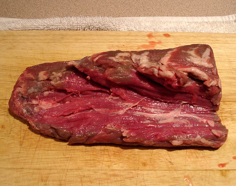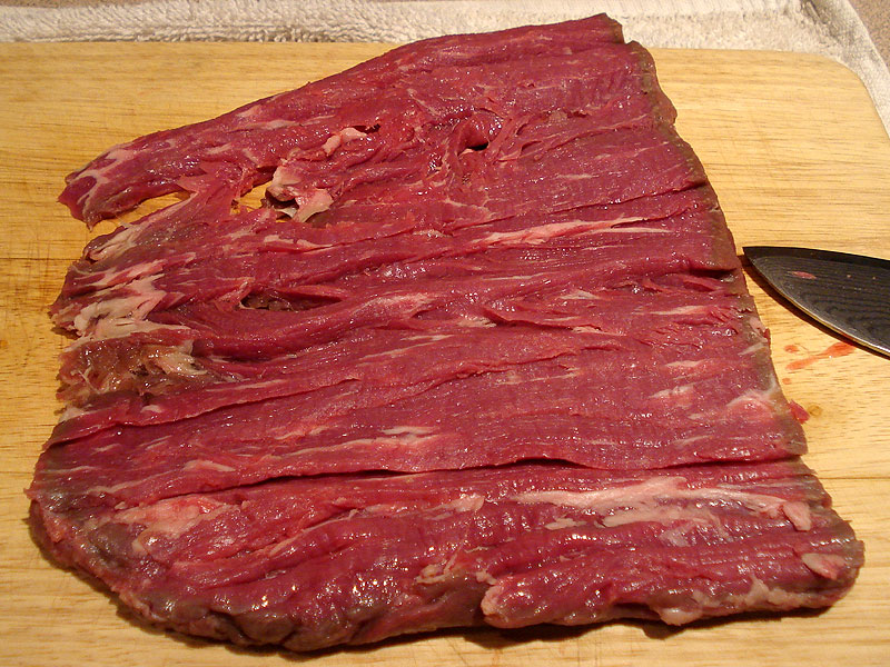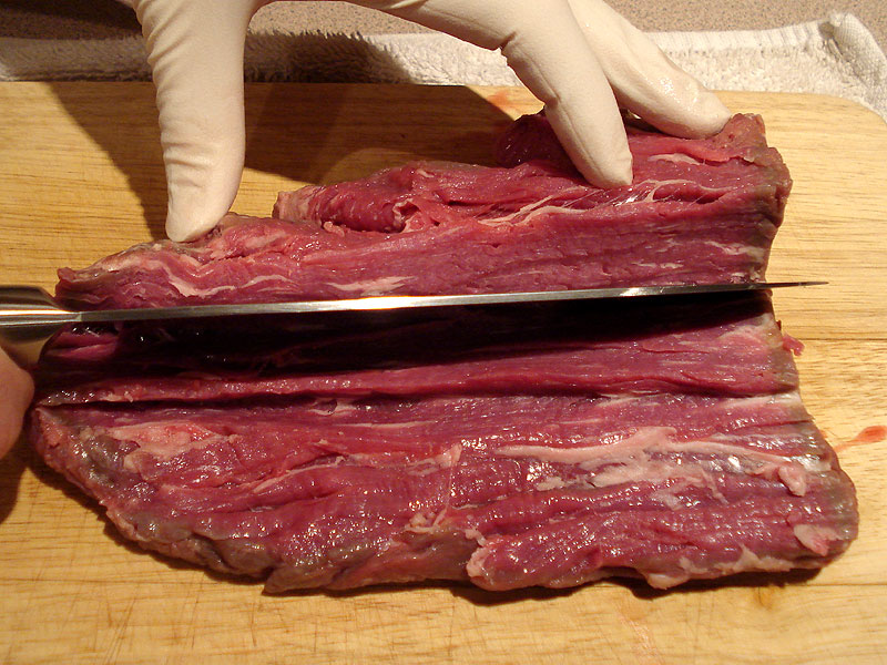 Take a knife and butterfly it by cutting along the length toward the center. Spread out the cut, then cut again around the inside of the cut until you get a large flat piece.
