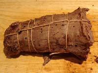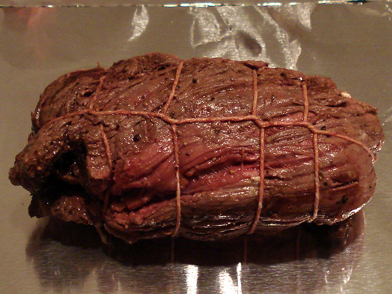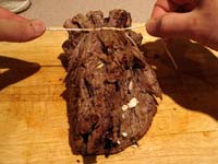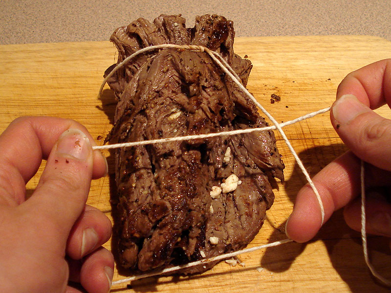 Flip the roast over and weave it through the loops on the bottom, then flip it again and tie it back to the original loop.
