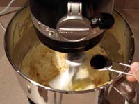 Add in the vanilla and milk or liqueur and continue mixing.