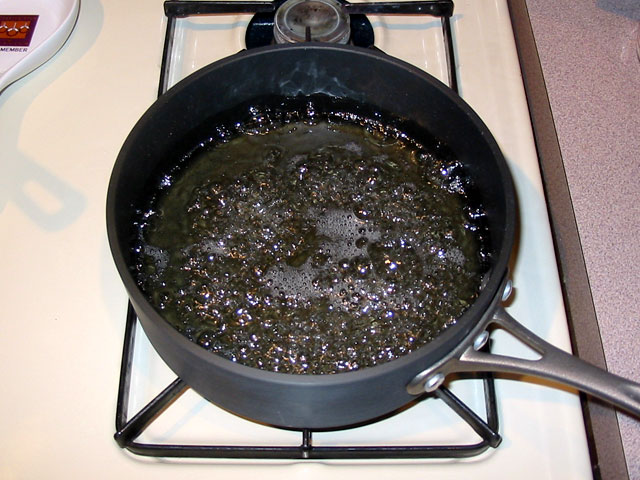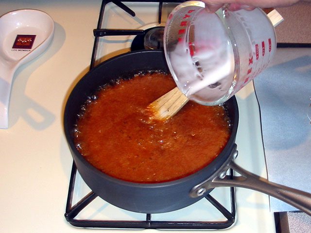 The darker it is, the deeper the flavor, but it may become slightly bitter just before it burns. When the caramel reaches the darkness you desire, turn off the heat and pour in the cream. Stir until smooth.