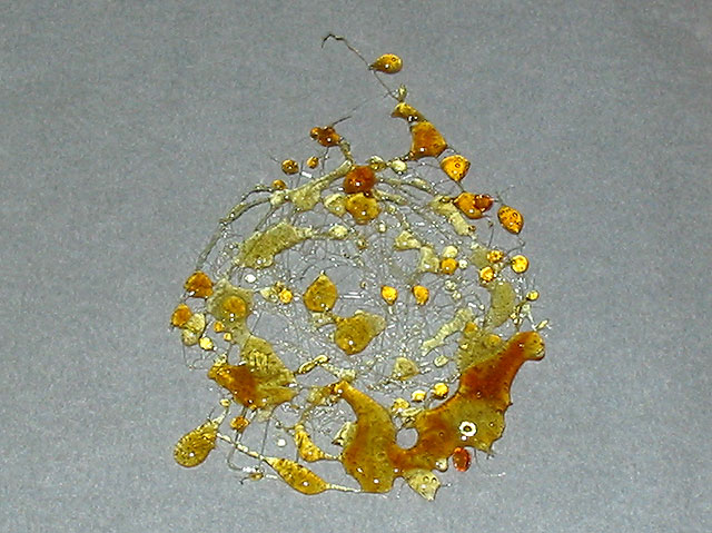 At this stage you can remove the caramel from the heat. If you let it cool until the syrup flows instead of drips off a spoon you can make some sugar art. Simply spread out some parchment paper over a cool surface (like an upside down cookie sheet) and drizzle the syrup in patterns.