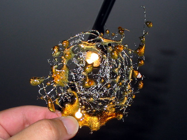 The syrup will pass through a number of stages which are descriptions of how the solution behaves when added to cold water. As the concentration of sugar increases, it goes from thread stage to ball stage to crack (hard) stage. This picture is probably around a hard thread stage.