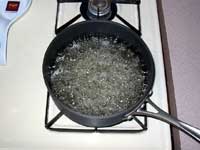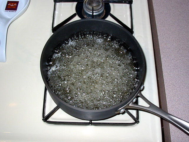 Bring the syrup to a boil. This will cause the water to evaporate. As the water evaporates, the syrup will thicken and increase in temperature. You will notice this because the bubbles will start to get bigger and slower. Do not stir the syrup or drop any sugar crystals into it or you risk crystallizing the entire super-saturated solution.