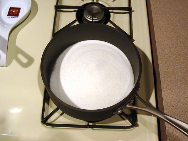 You can skip the sugar art stage or you can reheat the sugar and continue on. Make sure you have the butter and cream ready before you get to this point. Once the caramel has started to turn brown, watch it carefully so it doesn't burn. It will turn from light brown to dark brown pretty quickly.