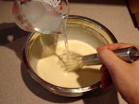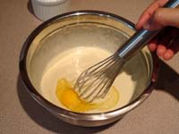 Add in the eggs and continue whisking until smooth, however do not beat the batter as you do not want to incorporate air bubbles into the eggs.