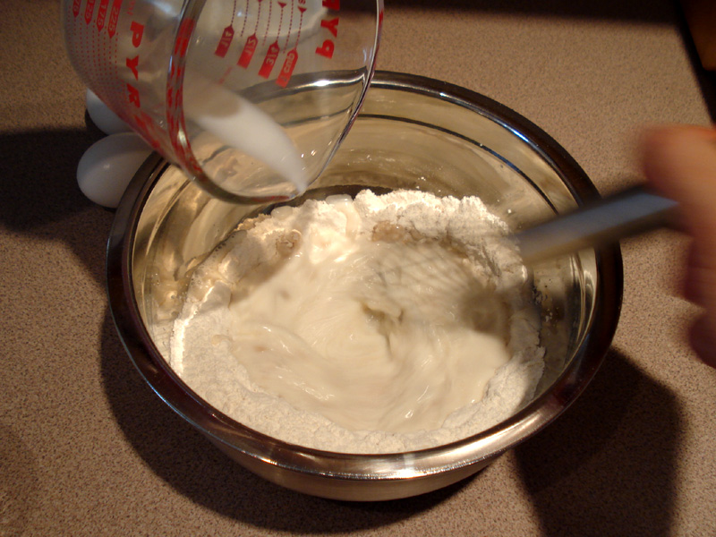 Sift and combine all the dry ingredients, then add in the milk and whisk to prevent lumps.