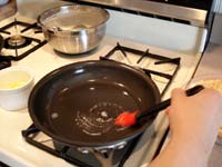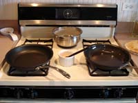 Get ready to cook by preparing a small amount of oil or melted butter to brush your pans with. Also put your burners on medium heat and give them 5 minutes to heat up. This will insure that your pans are cooking correctly every time and you can adjust the heat as necessary. I started with my ranges set to 7, but after a few crepes, they were much more consistent at 4-5.
