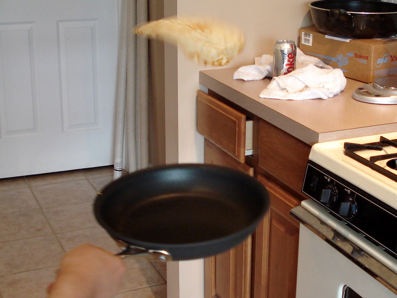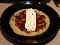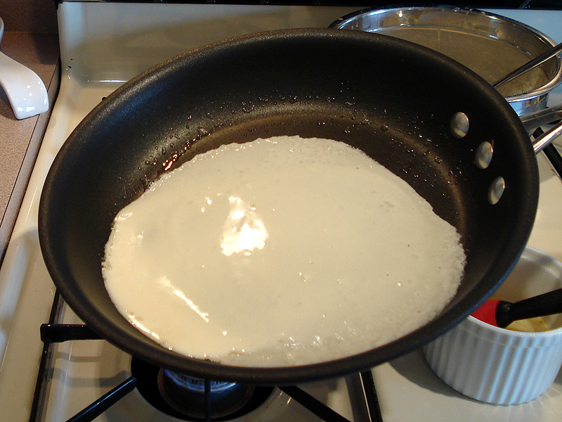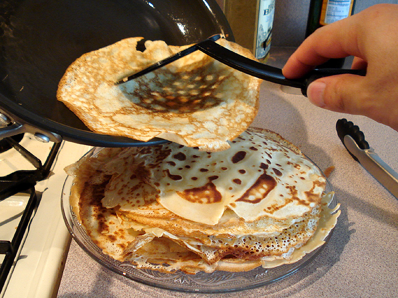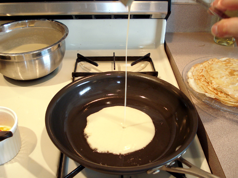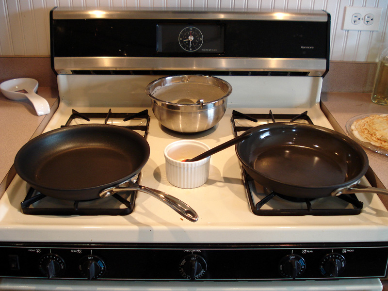 Here you can see I had two pans, one non-stick and one anodized aluminum. Once you've done a few crepes you will be able to do two at a time without a problem. Both pans worked fine, but flipping by hand was only possible in the non-stick.