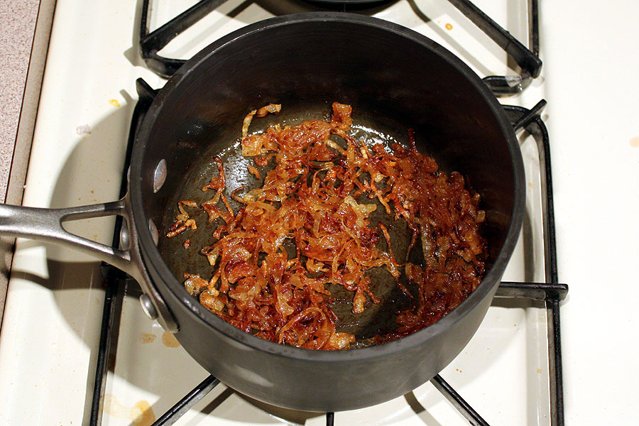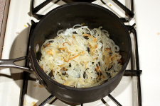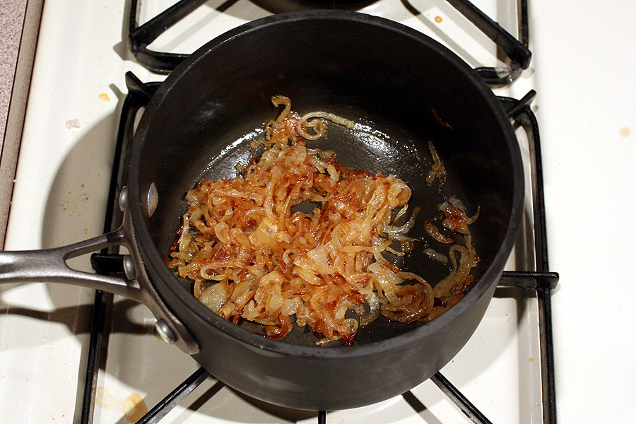 Allow all the liquids to evaporate (10-15 minutes) and lower the heat to medium-low and continue to sautee until the onions reach a nice golden brown.