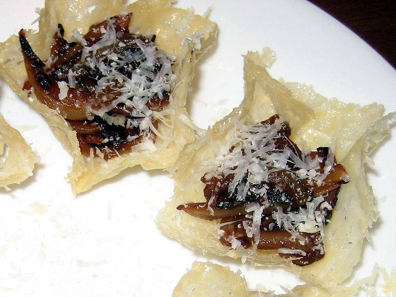 To assemble the final product, carefully twist the cup off the shot glass, then place right-side-up on a plate. Drop a crouton in the bottom and then fill the cup with a little caramelized onion.