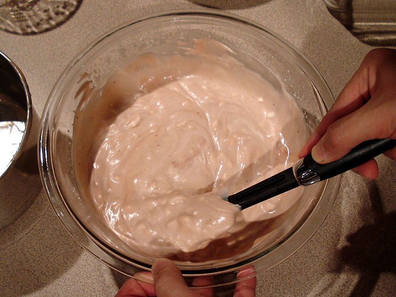 Then add the syrup/egg mixture back in with the rest of the syrup/egg mixture. Mix until incorporated.