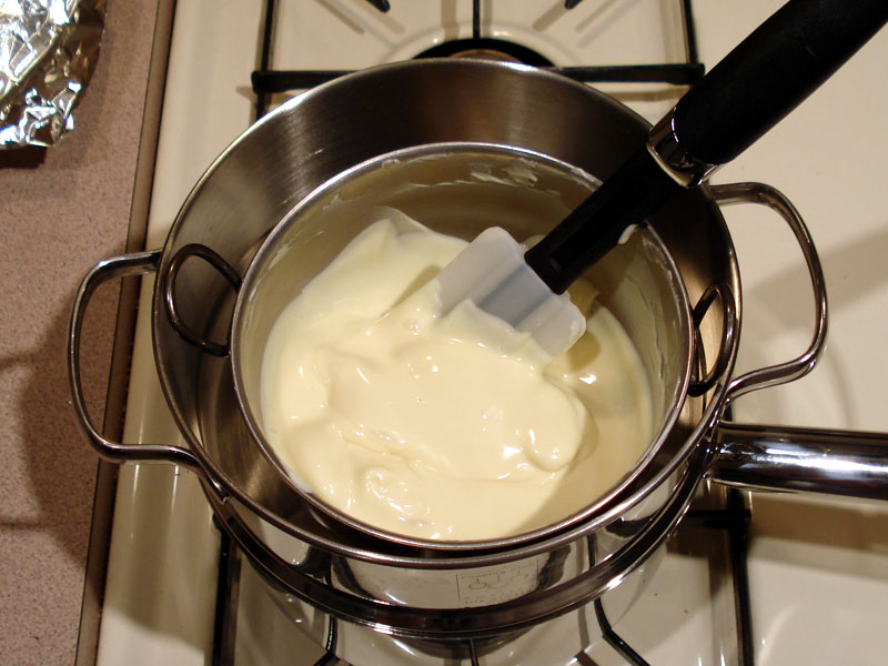 Prepare a double boiler and melt the white chocolate with the cream, stirring until smooth.