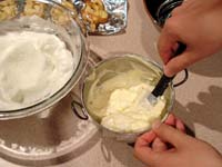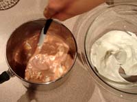 When the milk/egg mixture is cool but not set, gently stir in 1/3 of the whipped cream. |
