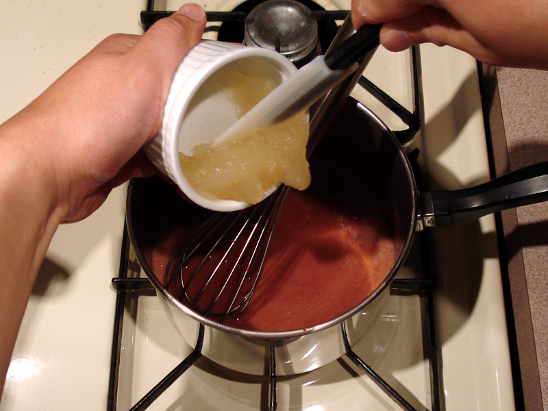Add the bloomed gelatin to the syrup/egg mixture, stirring until the gelatin is dissolved.