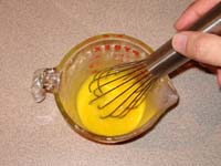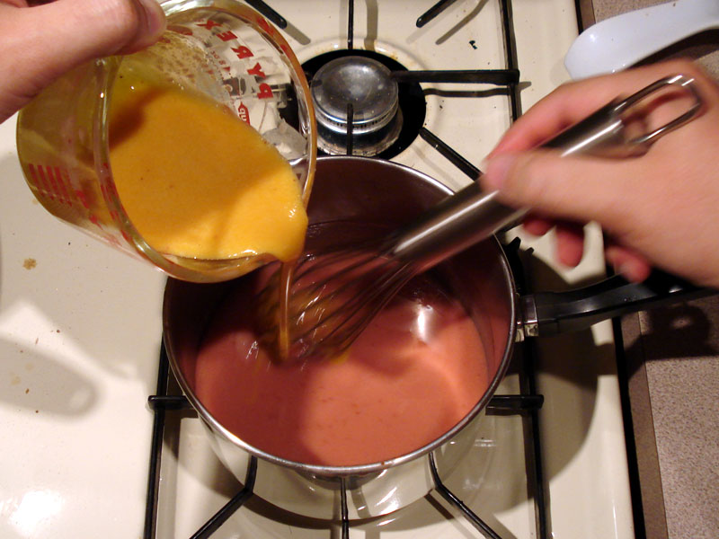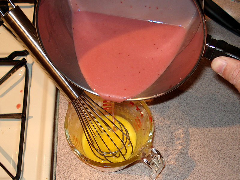 Slowly add 1/3 of the hot lychee syrup into the egg yolks, mixing so as not to curdle the eggs.