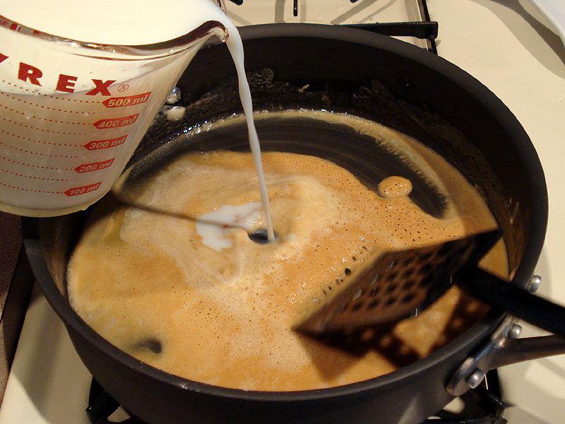 When the roux gets to the darkness you desire, add a third of the liquid. It will boil very quickly so watch out for steam. In this example I am using milk. You can use any liquid you desire, water, milk, stock, etc.