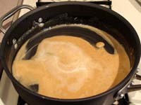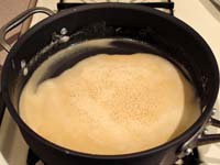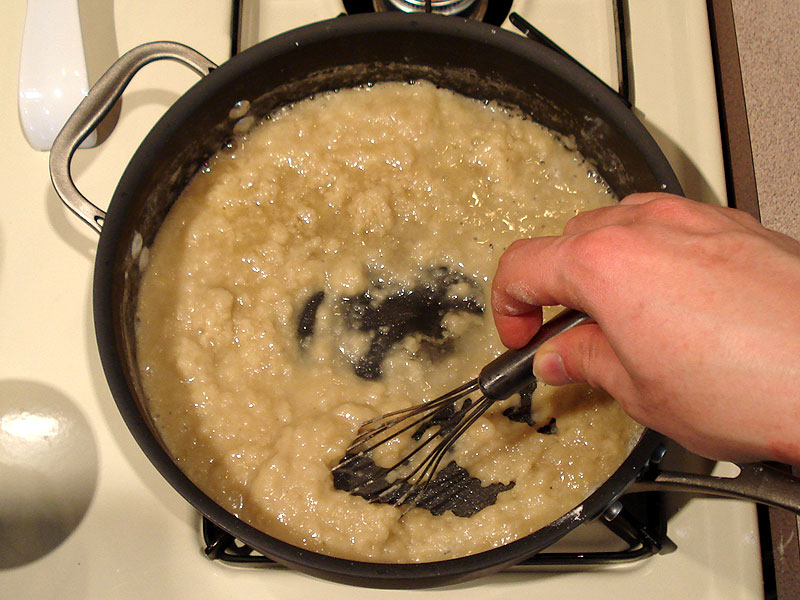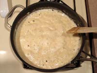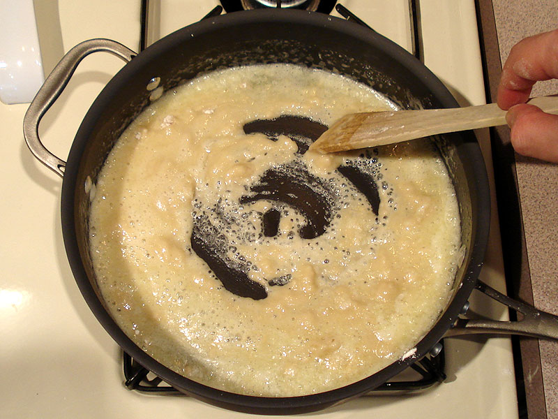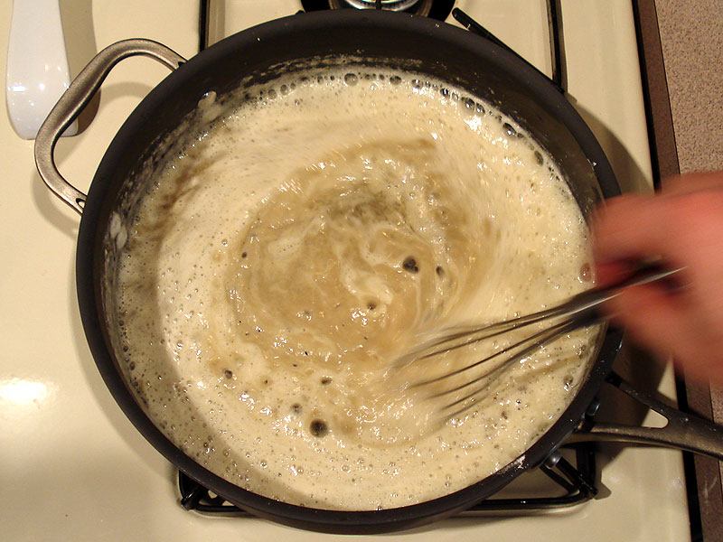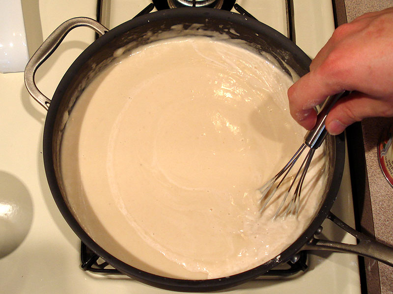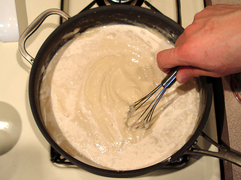When the roux is smooth again, add the rest of the liquid, continuing to whisk to keep it smooth until it starts to simmer.