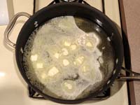 | Heat your fat over medium-high heat. In this example, I'm using butter so melt it until the water in it just starts to sizzle. If using an oil, such as olive oil, heat it until a drop of water just starts to sizzle. |
