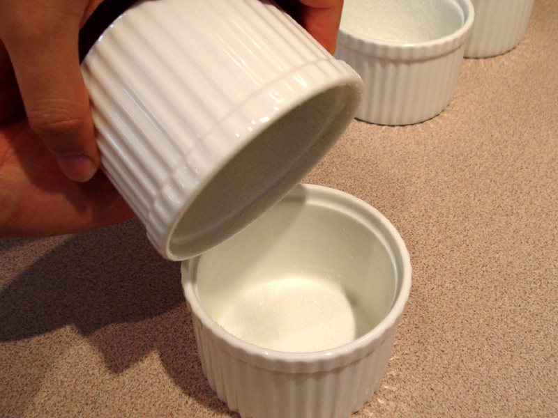 The easiest way to do this is to put in 1 tsp sugar and shake to coat the bottom. Then rotate the ramekin at an angle over another ramekin and slowly pour the sugar out to coat the sides, collecting the excess in the next ramekin.
