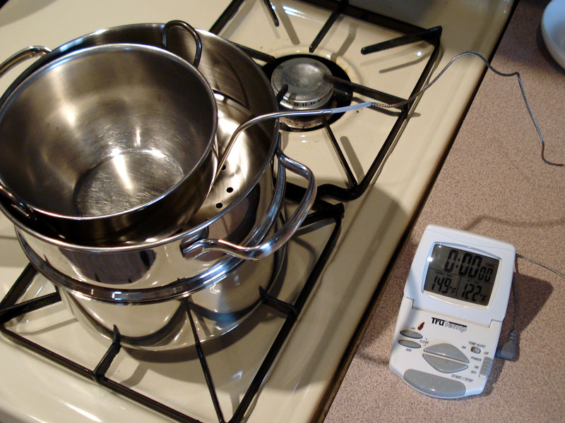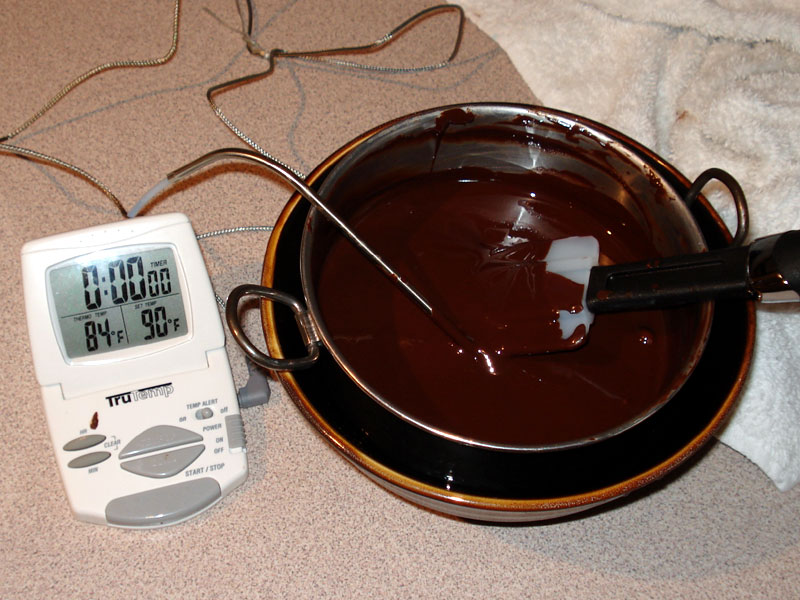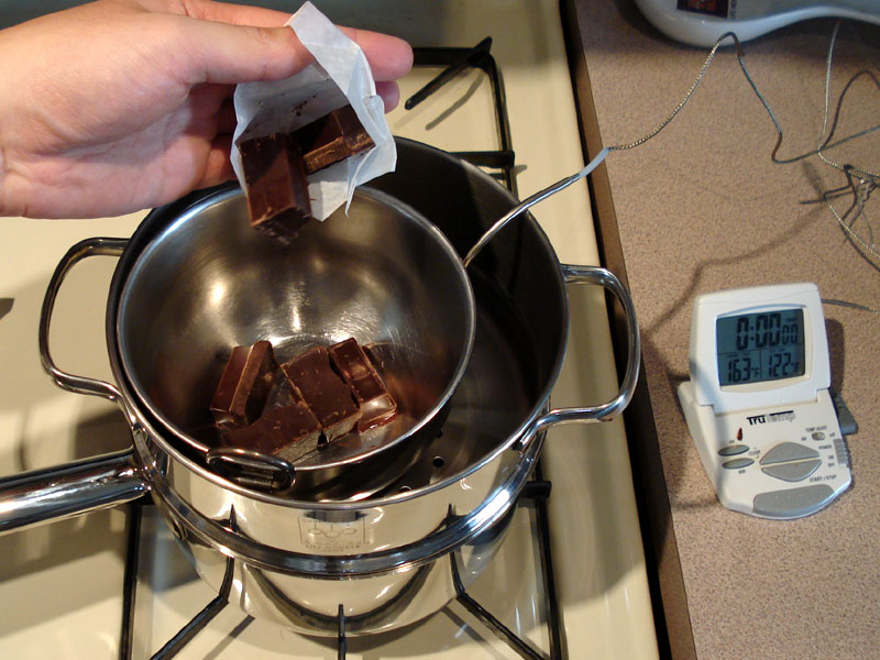 Because you must work within such a narrow band of temperatures, heating the chocolate can be quite a challenge. Most people use double boilers, though professionals may use a controllable chafing dish of some sort. Alton Brown recommends using an adjustable heating pad/blanket. I just use a double boiler and have come up with a simple trick to help regulate the heat.