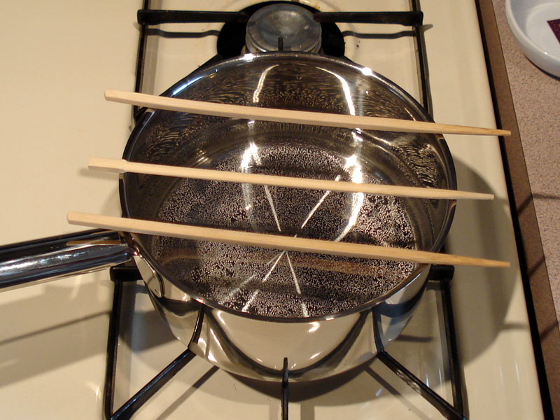 | If you don't have a double boiler (and who does anyway?) you can make one. Use a few chopsticks placed over a pot and put your bowl or another small pot on the chopsticks. Just be careful as the chopsticks aren't always very stable. I recommend square ones. Otherwise if you have a small grate or a cooling rack, you can use that instead. |