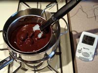 Just one note of caution. Once you have melted your chocolate, getting any impurities, such as a drop of water, into the chocolate can cause it to sieze. Basically all the crystals are shocked into a new configuration and the entire mass of chocolate literally solidifies into a crumbly mess. If this happens, you will not be able to use the chocolate for dipping nor can you re-melt it. However, you don't have to waste it. Simply add more liquid (cream, coffee, water, liqueur) and create yourself a nice chocolate sauce for fondue or to pour over ice cream or other desserts. |
