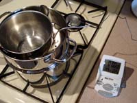 Once you've assembled your your double boiler, you can fill the bottom with water and turn on the stove. Put your small pot or bowl on top to begin heating. At this point, I like to put the thermometer into the water so I can see how hot it gets.