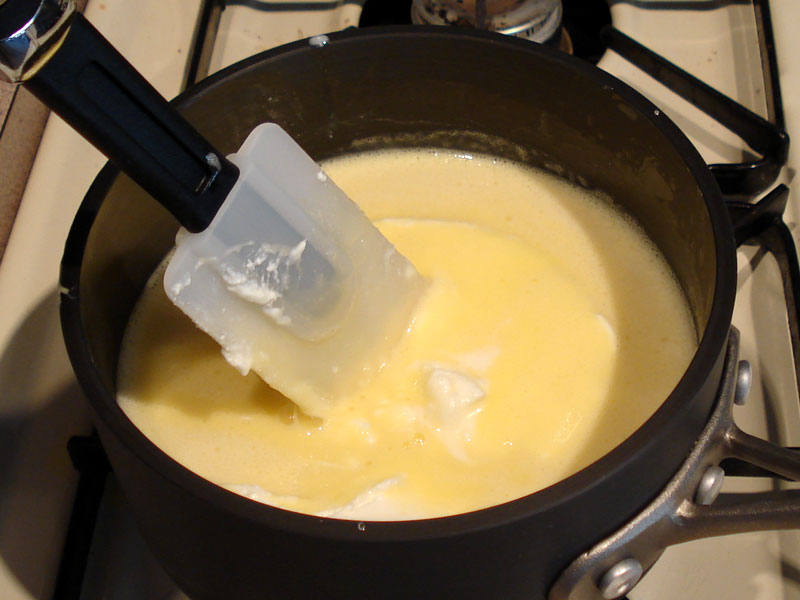Transfer the custard o a heavy bottom sauce pan and cook over low heat until it thickens, 5-10 minutes. Do not let it boil.