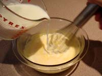 Slowly pour 1/3 of the milk into the egg/sugar mixture, whisking constantly so the milk doesn't cook the eggs.