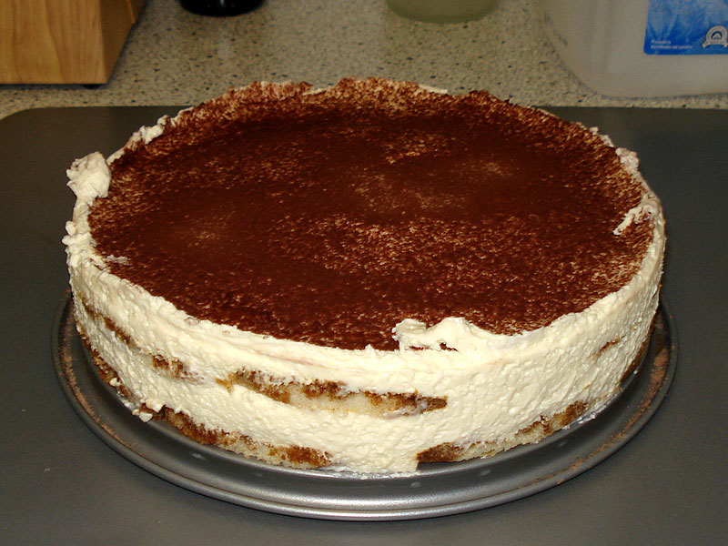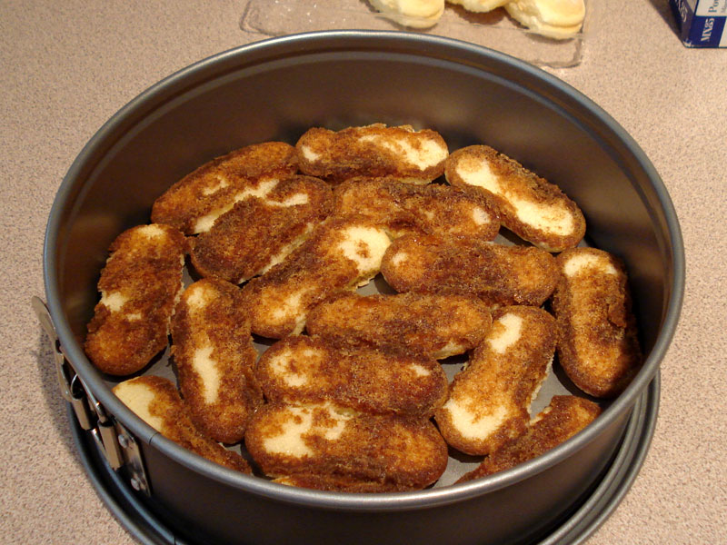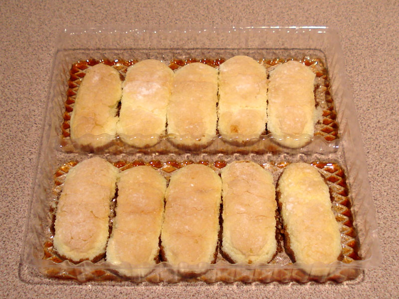 Fill the tray with one layer of lady fingers until the rum/coffee has been absorbed.