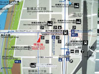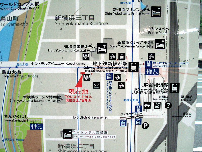 | To get to the Shin-Yokohama Raumen Museum, you can take the JR Yokohama Line or the Tokaido Shinkansen. Head out the west exit toward the north side of the station. You should be able to find a couple city maps (left) near the station exit and even a sign directing you to the museum (right). |