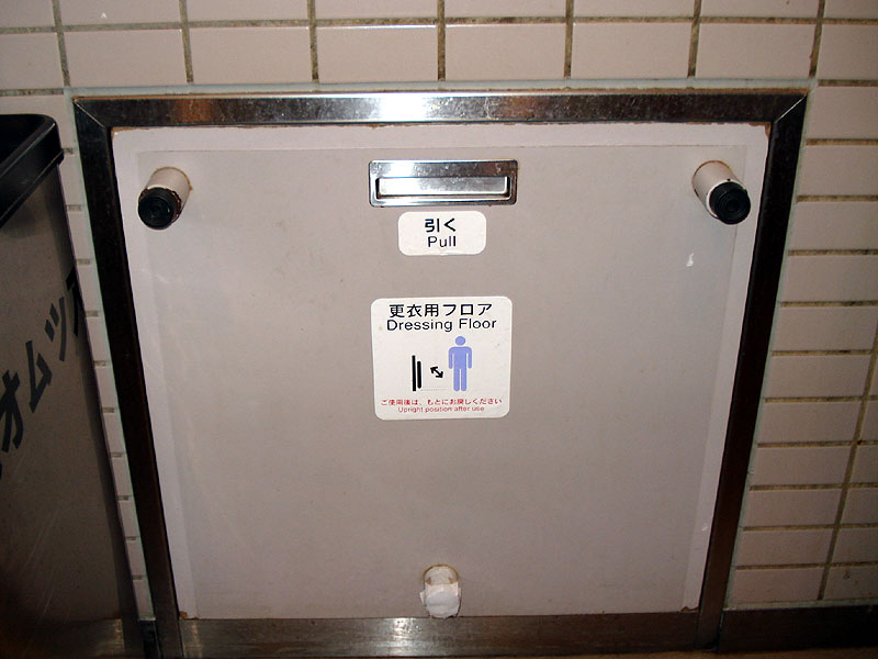 | At Narita, I found this in a restroom. It's a dressing floor that you can pull out so you have a place to stand without touching the dirty floor. It's not just practial and clean though, it also provides insight into Japanese culture. The idea of a higher location being cleaner and more pure is very prevalent. The root of this is because in ancient Japan, many houses were built directly on dirt and they would have separate outdoor and indoor shoes. Today you can see this in many Japanese houses which have a gein-kan. It is an entrance area where you remove your shoes, then you switch to slippers and step up a level. Tatami (bamboo mat) rooms are often another step higher and you remove your slippers before entering those as well. Additionally, you switch to different slippers when entering the toilet area, which is often at a lower level and separate from the bathroom and rest of the house. |