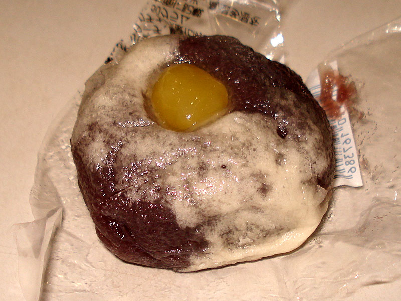 | This is manju, which is kind of like mochi but instead of rice dough, there is a thin wheat based bread. This is a wrapped one, but fresh ones are often steamed so you get them nice and hot. |