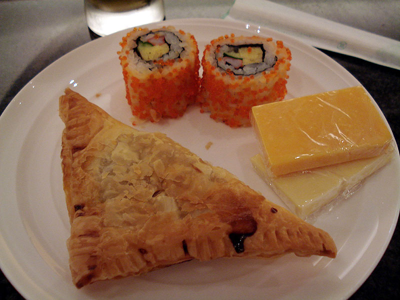 Also, since I was platinum on AA, I got free access to the Ambassador Club lounge where they had curry pies, sushi, cheese and tons of other food. They even had an automated Sapporo machine that would lower the draught tap to the bottom of your glass and raise it up as it filled your glass to minimize the head. Fancy schmancy. |