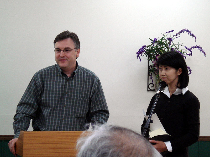 | Chip gives a sermon at Kokobunjidai Church, translated by Ai. |