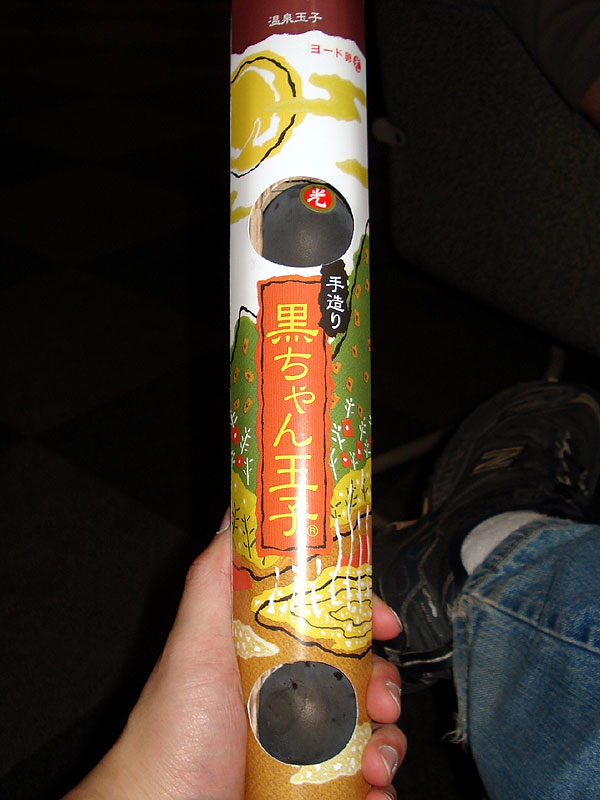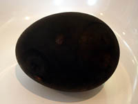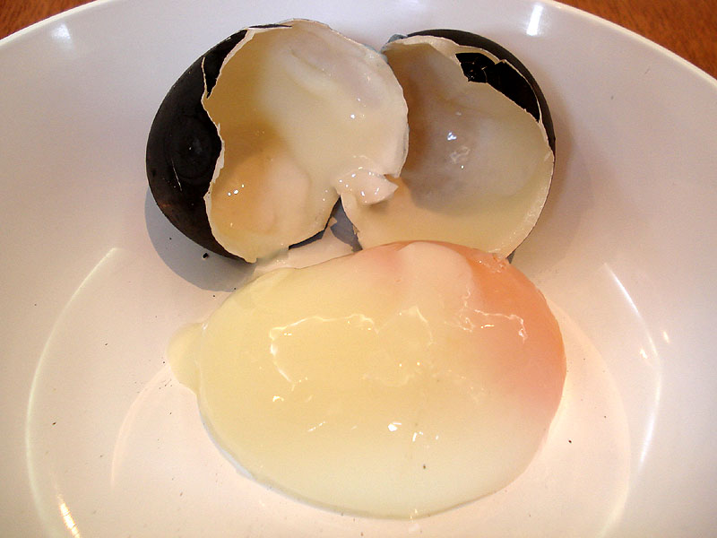 | An on-sen (hot spring) egg. Chickens are fed a seaweed diet which turns their eggs black. Then they eggs are slow cooked in a naturally hot spring, resulting in the softest boiled egg possible. For the most part, these tasted just like regular eggs, but even though I like runny egg yolks, I don't really like runny egg whites. |